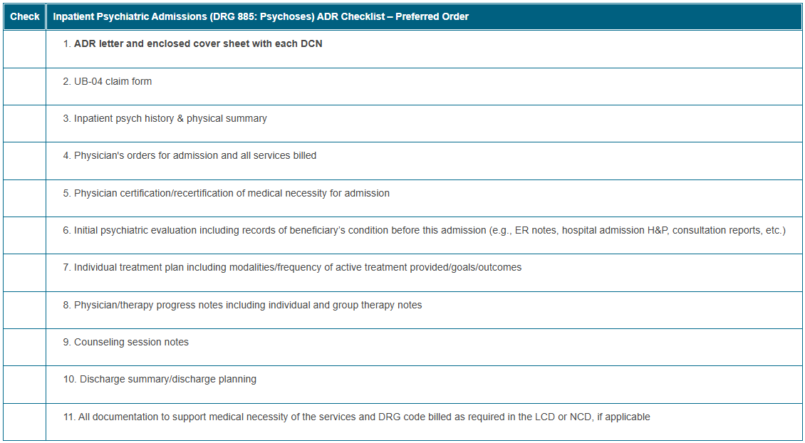 Before responding to an ADR, use the checklist below as a reference to ensure each claim meets Medicare’s policy requirements. Please submit all required documentation outlined in the CMS Medicare Benefit Policy Manual and any applicable Local Coverage Determination (LCD) or National Coverage Determination (NCD). Providers are responsible for submitting complete and accurate documentation per regulatory guidelines for each claim. Ensure documentation within any aspect of the medical record that you submit belongs solely to the intended beneficiary, and documentation for another beneficiary isn’t present.