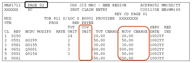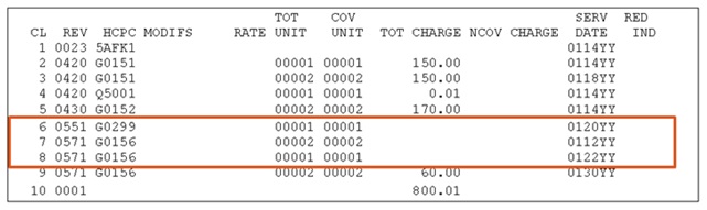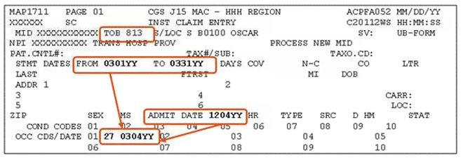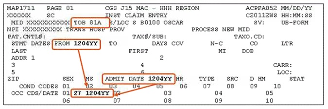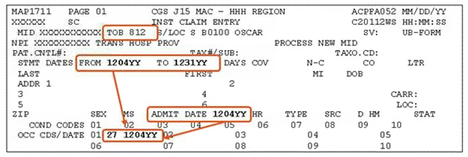 - A date of service that falls within the "FROM" and "TO" date of the home health claim