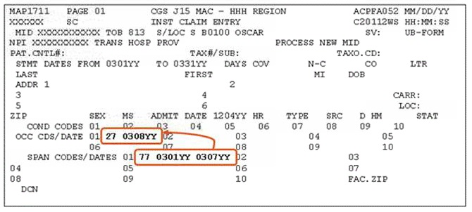 - Occurrence code 24 is entered in form locator (FL) 31-34. The OCC CDS/DATE fields are found on FISS Page 01. Enter occurrence code 24 in the first available field on this page.