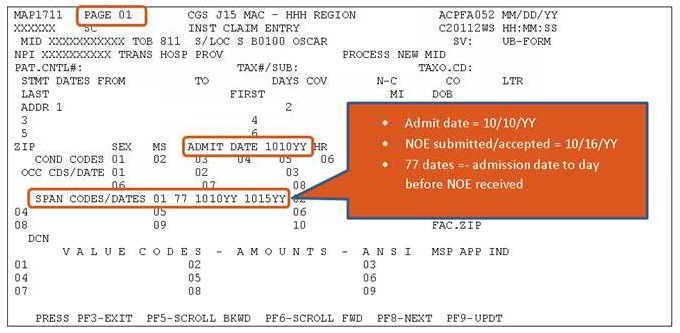 When an NOE is untimely, the noncovered days from the admission date to the day before the NOE was received must be reported on the claim with the occurrence span code 77.