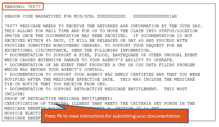 FISS Page 08 (below) indicates the ADR edit code '78877'. This code is specific to claims where documentation is being requested due to an exception request for an untimely NOE. Page 08 provides: