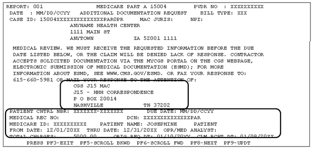 Submit your documentation so that it is received by CGS on/before 45 days ("DUE DATE" on FISS Page 07). Ensure that you allow ample time for mailing and processing of the documentation when received. This will prevent the claim from inadvertently denying. Mail to the address that appears on the ADR letter or FISS Page 07: