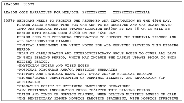 ADR OUTCOMES – Possible outcomes of the MR ADR include payment in full (P B9997), partial payment (P B9997), or a full denial (D B9997). Providers are notified of the payment determination via the FISS status/location, as well as their remittance advice. When a claim is denied with reason code 56900, indicating that the medical documentation was not received by CGS, or was not received timely, a "56900 reopening" may be requested within 120 days of denial to have the medical documentation reviewed by the Medical Review department, without utilizing the Medicare Appeals Process. All other denials for which the provider disagrees may be appealed using the Medicare Appeals Process.