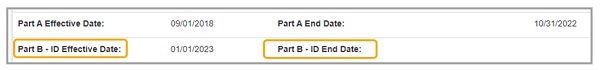 If a beneficiary is enrolled in the Part B-ID benefit, then their Part B eligibility in myCGS® will display as Part B – ID Effective (and End) Dates, as shown below.