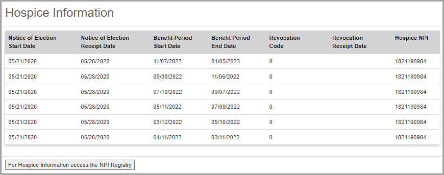 NOTE: myCGS® will return all hospice episodes that appear in the beneficiary's records within 16 months (one year prior to and four months after) of the date of service submitted in your request.