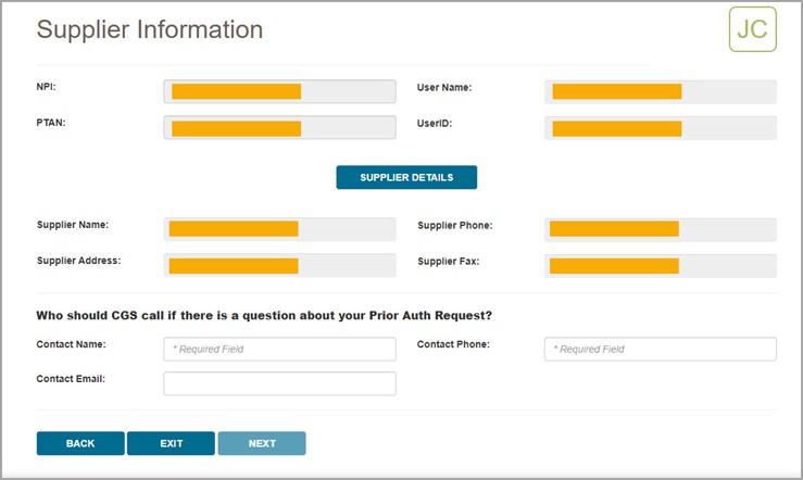 When you log in to myCGS® and go to the Prior Authorization Form Submission screen, you will be prompted to confirm your supplier information (NPI and PTAN), and then enter your contact information.