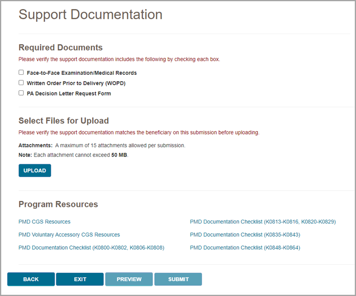 You will be asked questions about the beneficiary, the type of equipment, and other pertinent information about your Prior Authorization request. Once all the needed information has been obtained, myCGS® will provide you with a checklist of required documents that you must include with your request.