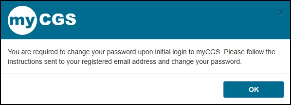 - Go to myCGS® and log in as normal. After entering your User ID and password, you will receive a message stating that you need to change your password. An email will automatically be sent to your address on file that contains a password reset link. Note that the password reset email may take a few minutes to be generated.