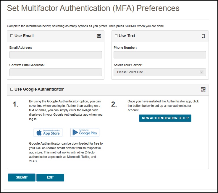 Then on the Set MFA Preferences screen, select the checkmark next to "Use Google Authenticator," or press "New Authentication Setup." A QR code will display on screen. Follow the instructions in your Google Authenticator app to scan the QR code, or manually enter the code. After you have successfully added the code to your app or web extension, press SUBMIT.