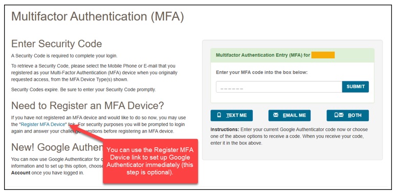 NOTE: If you do click on the Register MFA Device link from the MFA entry screen, you will need to re-enter ALL of your MFA preferences, not just Google Authenticator.