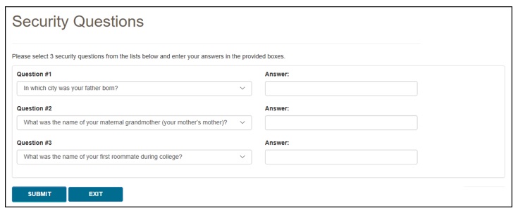 - After entering your MFA, you will then be prompted to reset your security questions and answers. As a security precaution, all users are required to follow this step the first time they log in to myCGS® 7.0. Choose three questions and then enter your answers to the questions. Be sure to choose questions and answers that are personal to you and that you will remember. You will need to be able to answer the security questions should you forget your password and need to have it reset. Note that the security answers are case-sensitive.