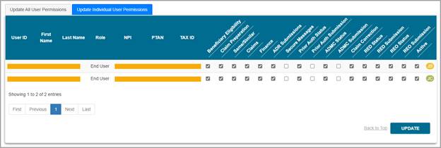La opción de Actualizar los Permisos de los Usuarios Individuales "Update Individual User Permissions" le mostrará la información de perfil de cualquier usuario que coincida con sus criterios de búsqueda. Tenga en cuenta que, si tiene más de un NPI/PTAN, puede haber varias filas para un solo usuario que comparte la misma información de varios NPI/PTAN. Los cambios realizados en los permisos de usuario en la opción de Actualizar los Permisos de los Usuarios Individuales "Update Individual User Permissions" se realizan con base el NPI/PTAN individuales por jurisdicción (B o C).