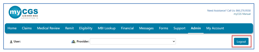 When you are done using myCGS, you must log out to end your session. To log out, click "Logout," which is located in the upper right of any screen in myCGS.