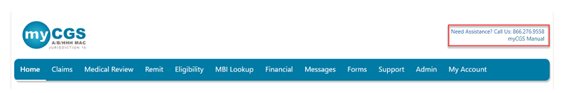 On each page in myCGS you will find the EDI Help Desk phone number for your line of business and a link to the myCGS User Manual.