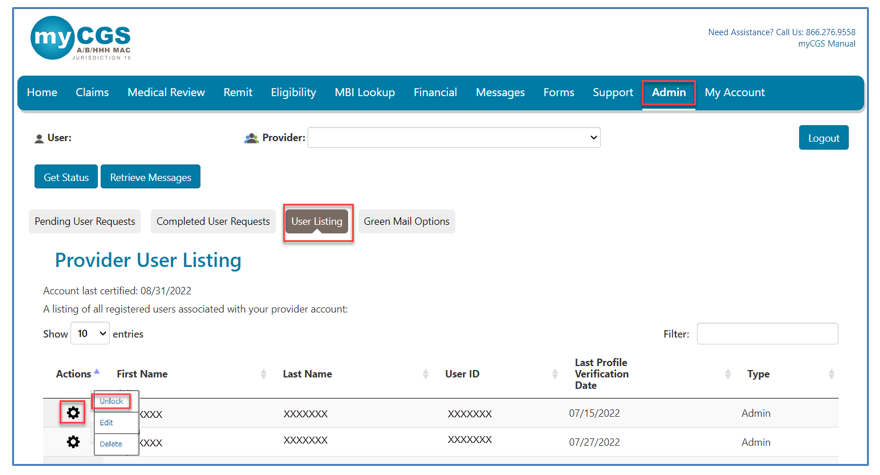 - The Provider Administrator can unlock the account from the "Admin"tab and the "User Listing" sub-tab.