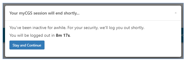 For security purposes, all myCGS sessions will automatically time out after 30 minutes of inactivity. A notification box will display when you are approaching your inactivity limit. If you wish to continue your session, click "Stay and Continue," and your session will be extended.