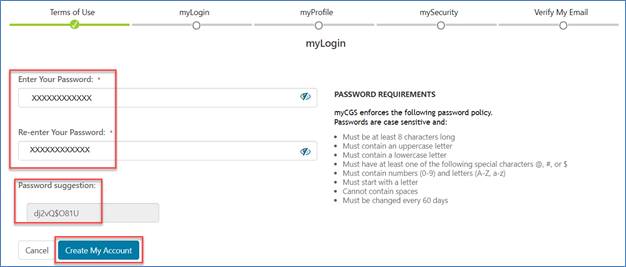 - Enter a password according to the password requirements noted on the screen. If you are in a secure environment, you may click the eye icon to see what you type. Also, if you prefer, you may use the password myCGS suggests. Click "Create My Account" when all fields are completed.