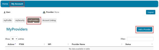 To gain access to provider information, your Provider Administrator may assign permissions for you to access provider accounts. You may also send a request to the Provider Administrator from your My Account tab under the myProviders sub-tab. Click on the "Add a Provider" button to complete the request.
