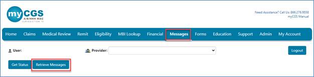 The "Messages" tab of myCGS will allow you access to a secure messaging system within myCGS. This messaging system will send messages and alerts regarding system access and functions performed while in myCGS. For example, when you submit a redetermination through myCGS, a confirmation message is delivered to your myCGS inbox, letting you know it was received and accepted for processing.