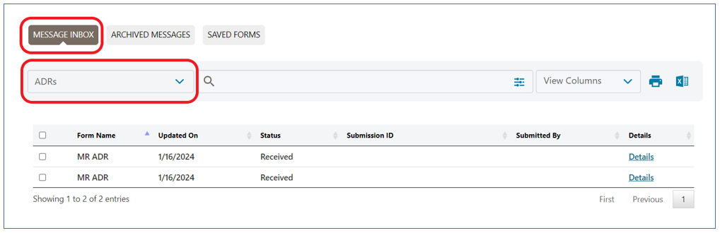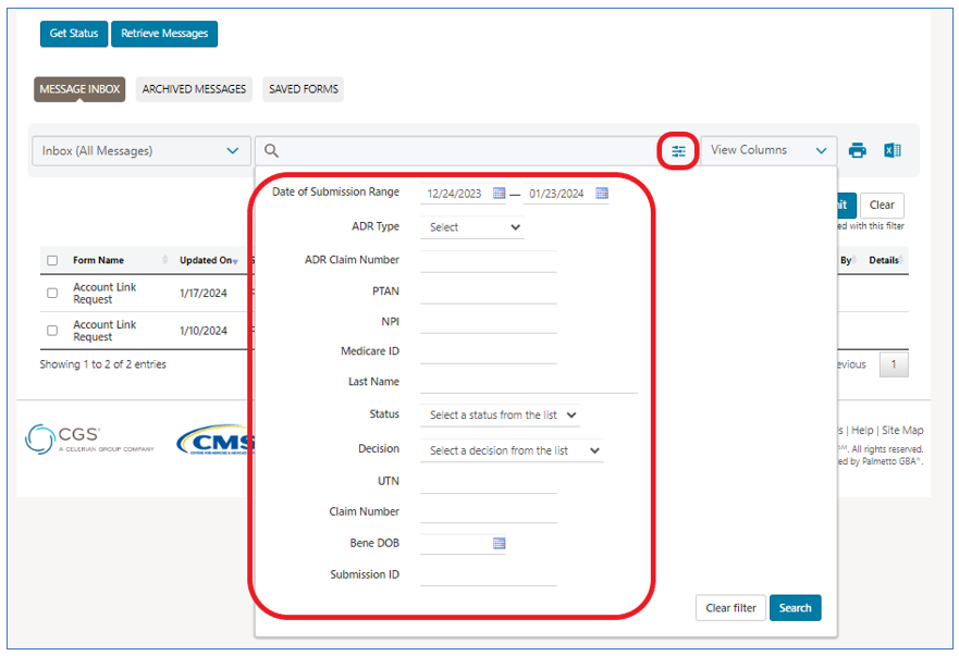 NOTE: Confirmation messages for Claim Inquiries you submit are not available when you filter by MBI or Claim Number; however, the confirmations can be found in the Claim Inquires inbox folder. Also, when in the ADR folder, you can filter by those related to MR and unrelated to MR; in addition to those related to the Prior Authorization (PA) program.