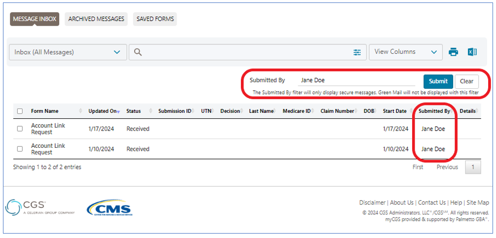 You can search other users’ messages by typing in their name and hitting “Submit”. Any active or disabled users within your NPI/PTAN will auto populate for easy selection.