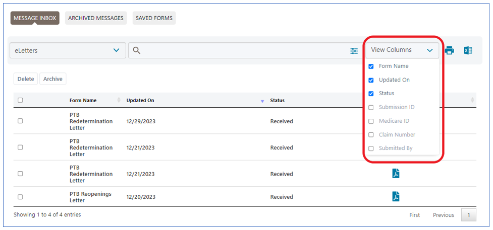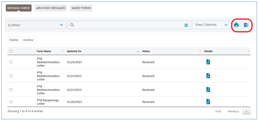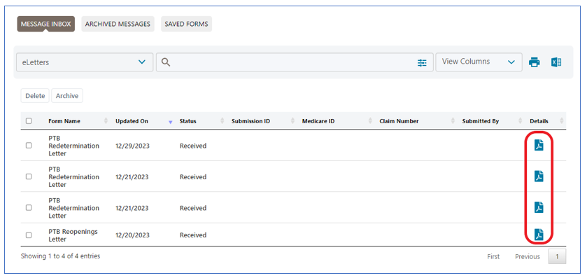 To save a step, you also have the option to download a PDF copy of the letter directly from your messages Inbox. Click on the download icon located in the "Submission ID" column.