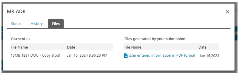 Click on "Files" to see a listing of files "You sent us" regarding this correspondence and an option to generate a PDF of "Files generated by your submission".