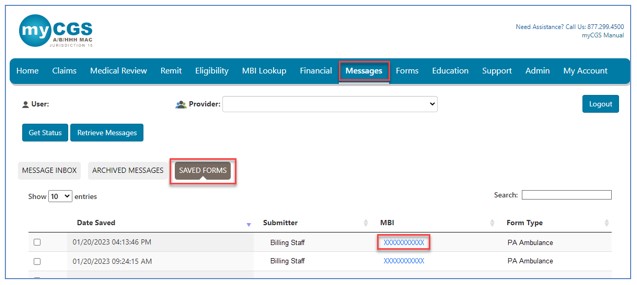 To access a saved form, click the link under the MBI column and it will load so that you can edit and submit it when completed.