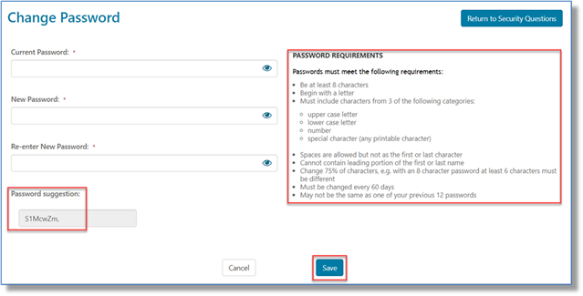 - Enter and re-enter your new password according to the password requirements. Click on the eye icon if you are in a secure environment and would like to see what you type in these fields.