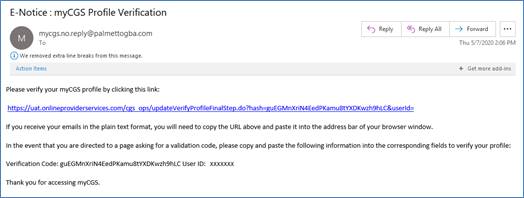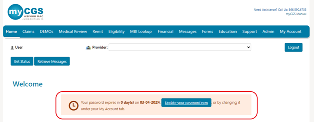 To meet CMS security guidelines, all users must verify that the information on his/her profile is accurate and current. This process is required every 250 days. myCGS tracks this timeframe to ensure this task is completed.