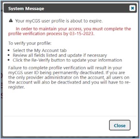 - As the verification period approaches, upon login, myCGS will notify you to verify your account. The pop-up message provides instructions on how to complete this task.