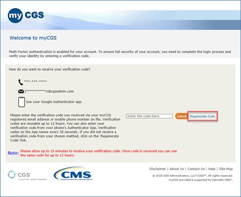 CMS requires us to implement an additional level of security when accessing myCGS due to the amount of sensitive information accessible through the web portal. The MFA process meets that requirement, as users are required to enter an eight-digit code before gaining access to myCGS.