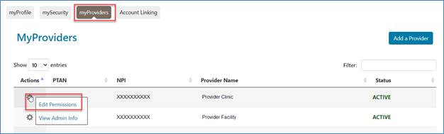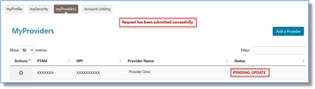 The accounts you have access to are all identified under the "myProviders" sub-tab. You will see the PTAN, NPI, Provider Name, and the status of that account.