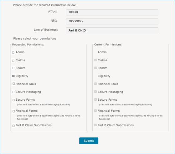 - If the provider information entered is verified to be for a provider that is already established in myCGS, you will then select the permissions you would like to have for that provider account.