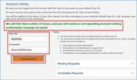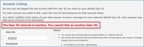NOTE: User IDs linked to your selected Super ID must be active. If, for example, the User ID has been terminated due to inactivity, was not recertified by your Provider Administrator, did not receive timely profile verification, or was terminated by your Provider Administrator, it cannot be linked to your Super ID.