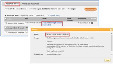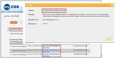 - As requests are submitted, confirmation that the requests were received are delivered to the myCGS inbox of the Super ID.