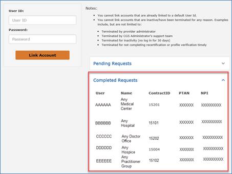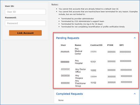 Account Linking allows you to combine multiple User IDs under one Super ID. From your new Super ID, you can select one of your linked accounts to perform functions available under that PTAN/NPI.