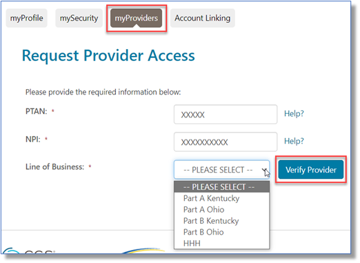 - Select the Line of Business of the provider you would like to add from the drop-down box then click the "Verify Provider" button.
