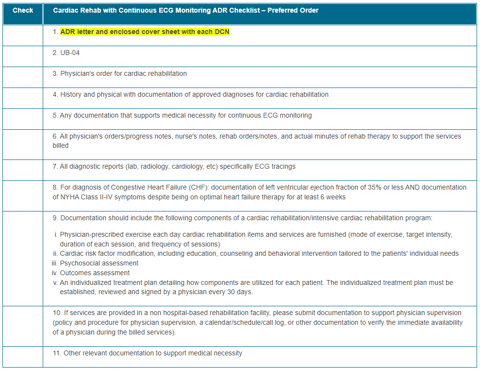 CGS recommends providers organize the medical documentation in the order indicated below. This will assist CGS in reviewing your documentation more efficiently, and will expedite the review process. Please ensure the documentation is submitted within 45 days of the Additional Documentation Request (ADR). If the documentation has not been received, the claim will automatically deny on the 46th day for non-receipt of documentation.
