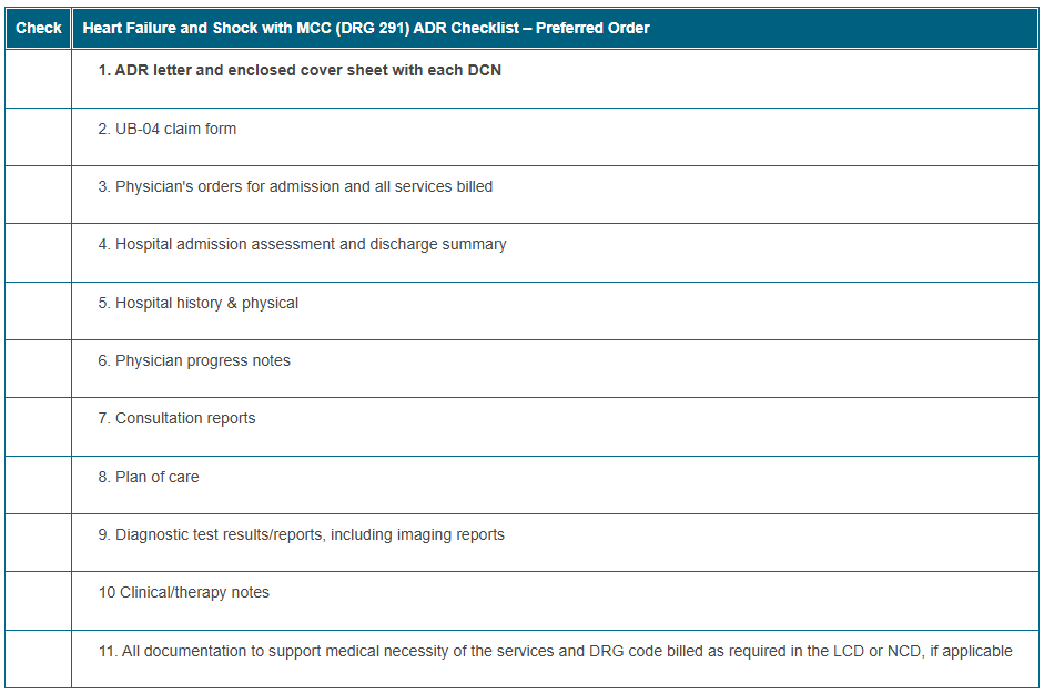 Heart Failure and Shock with MCC (DRG 291) ADR Checklist