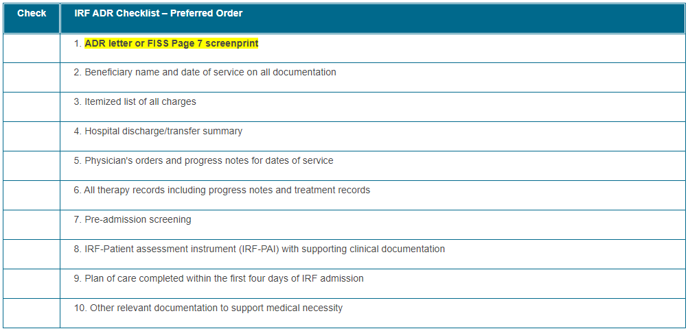 CGS recommends providers organize the medical documentation in the order indicated below. This will assist CGS in reviewing your documentation more efficiently and will expedite the review process. Please ensure the documentation is submitted within 45 days of the Additional Documentation Request (ADR). If the documentation has not been received, the claim will automatically deny on the 46th day for non-receipt of documentation.