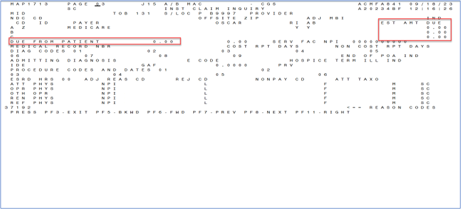 These fields will expand to accommodate 11 digits: EST AMT DUE (estimated amount due) and DUE FROM PATIENT.