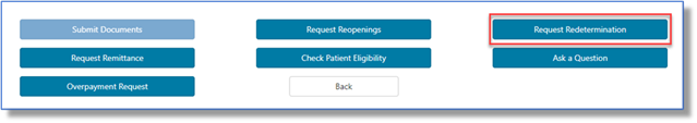 To submit a Redetermination, go to the CLAIMS tab and search for the claim. If the claim is still within the timeframe for a Redetermination (120 days of the initial determination), the Request Redetermination button will be available.