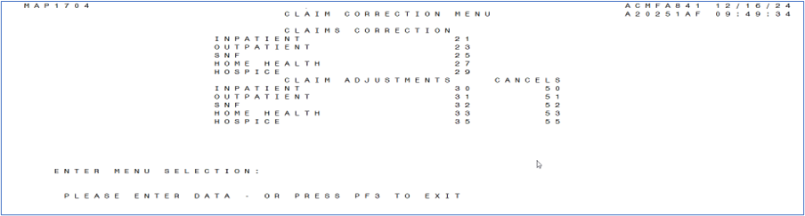 - Select ‘03’ (Claims Correction) from the Main Menu.