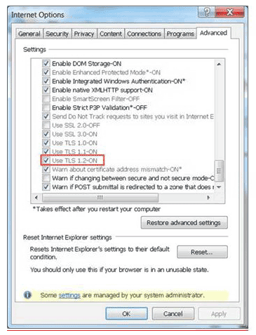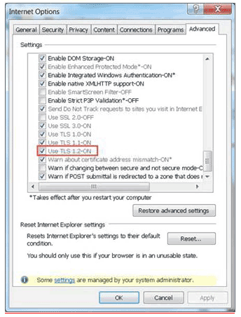 The option is typically located on the Advanced tab under Internet Options as shown in the image below. Users that do not have the proper setting selected may receive a "This webpage cannot be displayed" error.