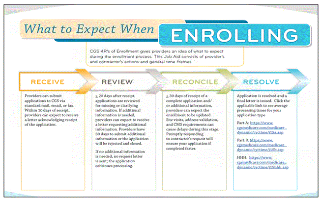 To better serve the provider community, CGS Provider Enrollment Management Team created an informational guide to the enrollment process that explains what happens after a CMS Medicare enrollment application is submitted. The “What to Expect When Enrolling”