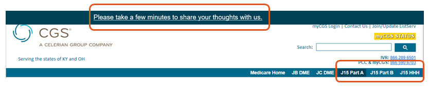 You can now share your opinions and suggestions about your online experience by participating in the newly enhanced CGS website survey. When you visit the CGS Jurisdiction 15 (J15) Part A, Part B, and Home Health & Hospice website or myCGS, you will periodically receive the pop-up shown in a message bar appearing at the top of the CGS website (shown below). The survey should only take 3 minutes of your time and once you take the survey, it will present again in 30 days.