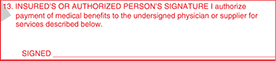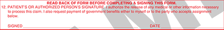 The patient’s signature authorizes release of medical information necessary to process the claim. It also authorizes payment of benefits to the provider of service or supplier when the provider of service or supplier accepts assignment on the claim.